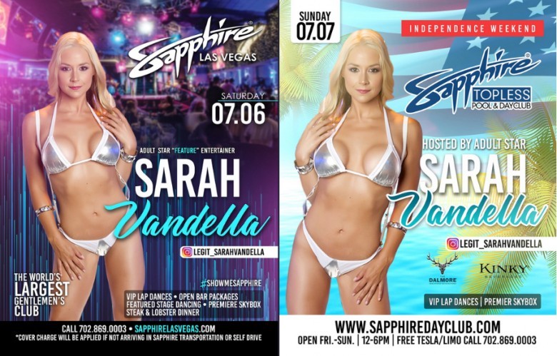 “Celebrate the long holiday weekend with me in Vegas—it’s going to be a party all weekend long at the gentlemen’s club and pool and dayclub,” says Sarah Vandella. “Both Sapphire venues are the best time in Vegas, and I can’t wait to see my fans!”