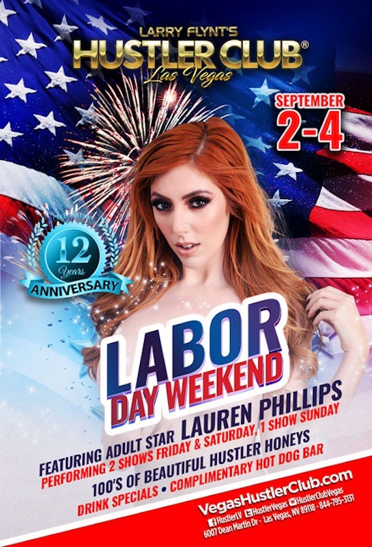 "I'm so excited to help the Vegas Hustler Club celebrate 12 incredible years and, of course, the last weekend of summer. I've got some special stage shows, outfits, and many surprises planned for all three nights. And you never know, I might just bring you up on stage with me," says Lauren Phillips.