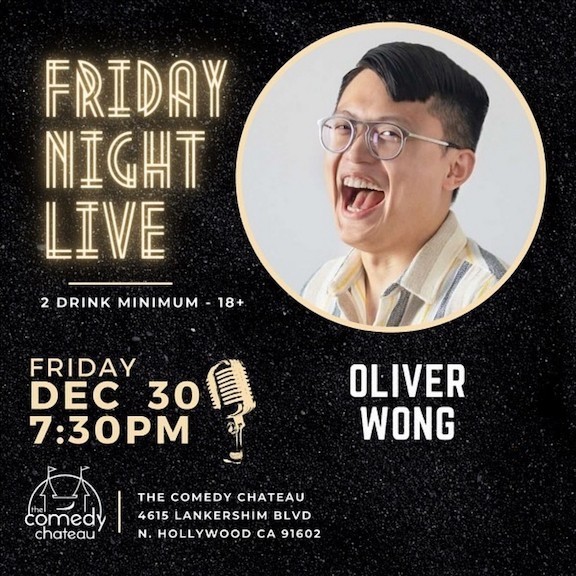 This Friday, December 30th, you get one more chance to see Oliver Wong do stand-up at The Comedy Chateau in North Hollywood. The Friday Night Live Show features Oliver and a stellar line-up of comedians, including Jimmy Brogan, Dave Nihill, Omid Singh, Sarah Hyland-Rosenstein, Miles Anthony Garrison, and more. The show starts at 7:30pm, and doors open at 7pm. Get your tickets online at thecomedychateau.com. Use the coupon code OLIVER and get free admission to the show.