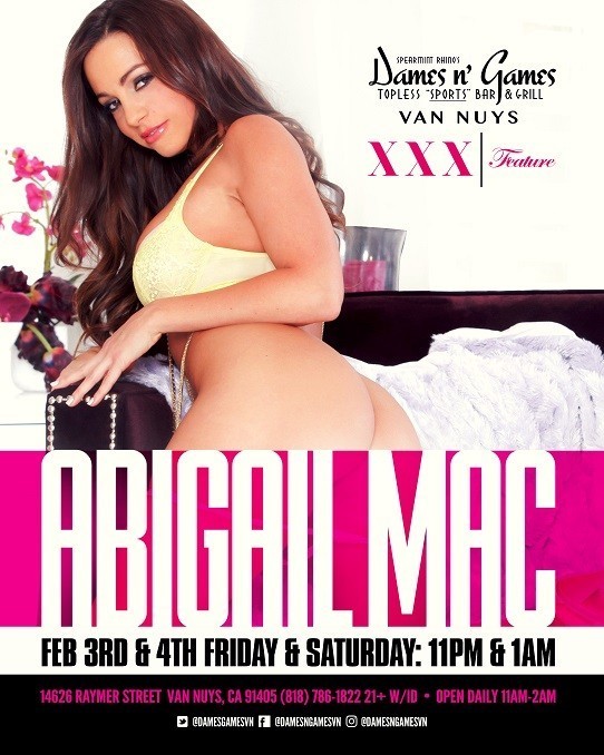 Abigail Mac has announced she will be feature dancing at the new Dames n’ Games Topless Sports Bar in Van Nuys from Feb. 3-4.