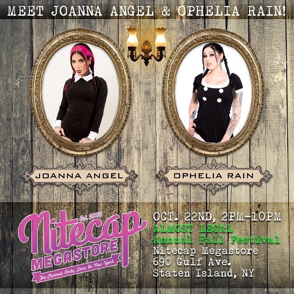 Award-winning adult superstar and BurningAngel Entertainment boss Joanna Angel and will join BurningAngel Girl Ophelia Rain for the 'Almost Legal' Annual Fall Festival at Nitecap Megastore in Staten Island, NY, Saturday, October 22, 2016. The ladies will be there from 6pm to 10pm.