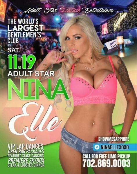 Stunning adult superstar Nina Elle will be feature dancing at Sapphire Las Vegas for one night only, Saturday, November 19th. There are several VIP Packages available, including a meet and greet with Nina herself and premium seating.