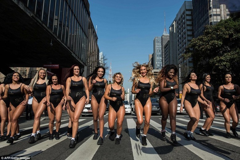 Striding down the streets of Sao Paulo in their black swimsuits, these glamorous models have been stopping the traffic as they promote the much anticipated Miss Bum Brazil competition.  What really matters is the 27 hopefuls kicked off the competition by showing off their (potentially) award-winning asses, all in unison. This year there's an amputee in the running, and based on these pics she's got a good shot at the prize.
