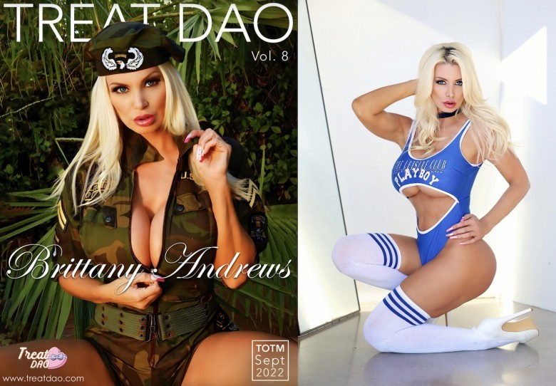 The latest issue of Treat DAO Magazine is out, and Brittany is on the cover wearing military fatigues. She’s been crowned the Treat DAO of the Month. She has smoking hot photos on Pages 3, 11, 18, 21, 28, and 34. Brittany’s multi-page feature starts on Page 35. The following13 pages have even more sexy photos of her and an exclusive interview that covers a wide range of topics, including her mentors, work ethic, highlights of her 30-year career, sobriety, and much more. Check it out at issuu.com/treatdao/docs/totm_september?fr=sM2NhZDQ2MTQ0MjQ. She also has TOTM NFTs available at treatdao.com/creator/BrittanyAndrews. And Brittany is also prominently featured on their social media.