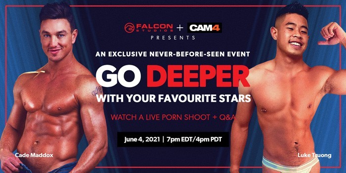 GLOBAL- For the first time ever, Falcon Studios and CAM4 partner to bring fans and viewers a never-before-seen live event broadcasting exclusively on CAM4.com and FalconStudios.com.   Touted as one of the most daring and unique live interactive shows in gay porn history, this 4-week series invites viewers from all around the world to experience the filming of an actual Falcon production in real time and go deeper with their favorite stars in ways never imagined.   This series launches on June 4th at 7pm EST with the first live show featuring Cade Maddox and Luke Troung.