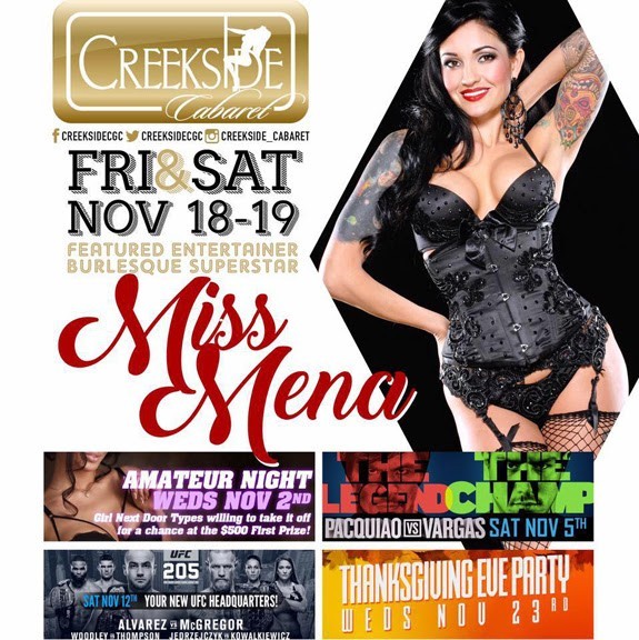 Miss Mena will be performing 2 shows nightly. Between shows she will be mingling with the guests, taking photos and doing lap dances. “I can’t wait to rock the stage at Creekside Cabaret Gentlemen’s Club and party with my fans!” says Miss Mena. These shows will definitely be standing room only - so make sure to get there early.
