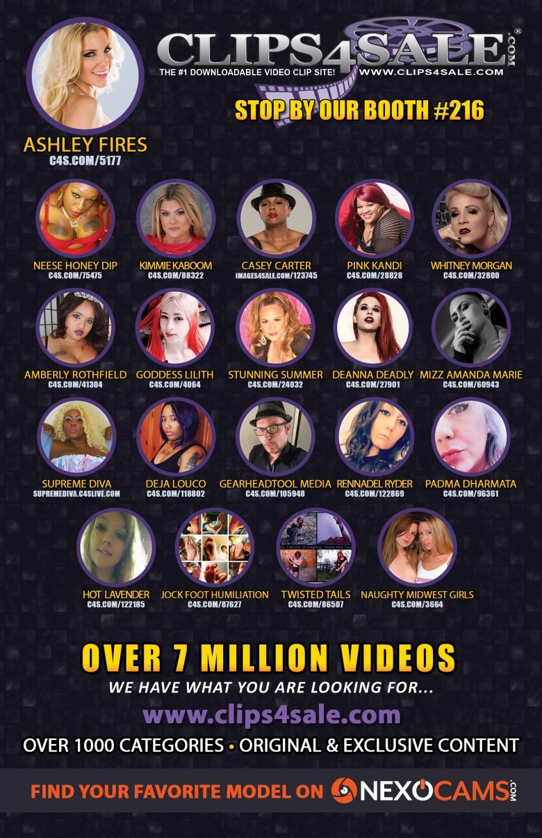 Clips4Sale has the exclusive on Exxxotica as the only video clips site exhibiting, plus they’re a sponsor. Spokesmodel Ashley Fires will be appearing, along with Neese Honey Dip, Kimmie KaBoom, Casey Carter, Pink Kandi, Deja Louco, Goddess Lilith, Miss Whitney Morgan, Deanna Deadly, Mizz Amanda Marie, Supreme Diva, Amberly Rothfield, Rennadel Ryder, Stunning Summer, Twisted Tails, GHT (AKA GearHeadTool Media), Padma Dharmata, Jock Foot Humiliation, and Hot Lavender (AKA Christopher Richardson) and many more.