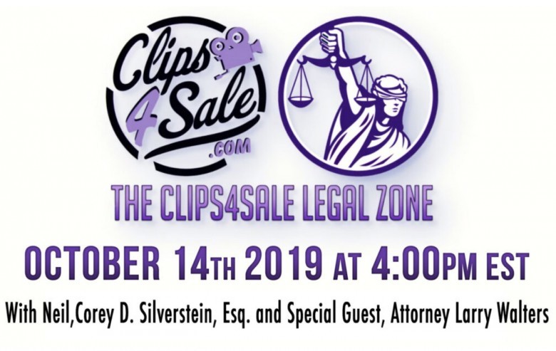 The Clips4Sale Legal Zone covers all the hot legal issues that affect the adult industry. The next upcoming Legal Zone is this Monday, October 14th, at 4pm EST/1pm PST. Clips4Sale owner Neil and premier IT attorney Corey D. Silverstein will be joined by guest attorney Larry Walters.