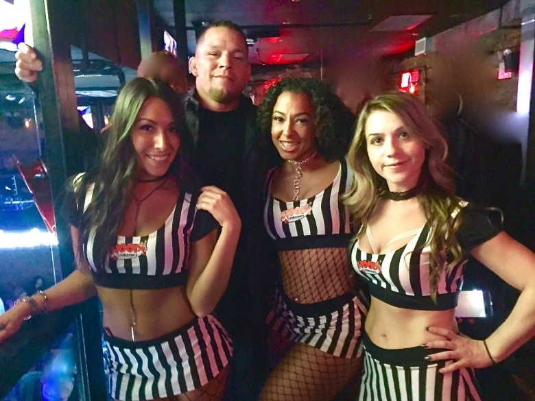 Nate Diaz is fighting Jorge Masvidal at UFC 244,” said Hoops girl Lucinda. “Nate Diaz was recently at a party here in the Hoops Cabaret VIP Man Cave and he was really nice. We even got him to smile—see the photo below!”