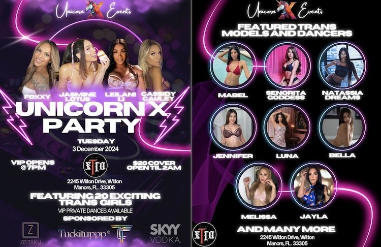 The Unicorn X Party is taking place at Club Xtra located at 2245 Wilton Drive in Wilton Manors, Florida. For pre-sale tickets and more info on the event, visit eventbrite.com/e/unicorn-x-party-tickets-1022837132397?aff=oddtdtcreatorWhen purchasing tickets, use the code Leilani10.