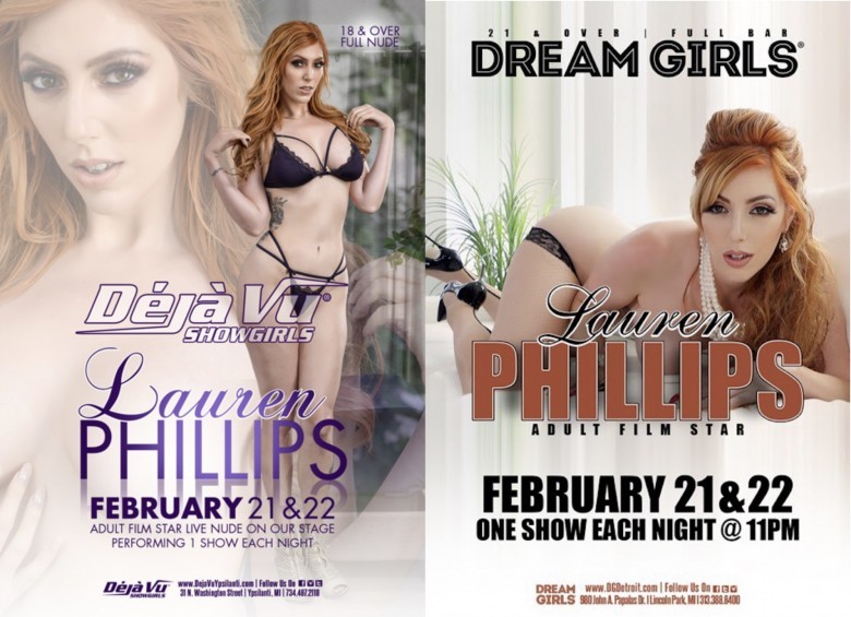 This Friday, February 21st and Saturday, February 22nd, Lauren will be dancing one show each night at both Déjà Yu Showgirls in Ypsilanti and Dream Girls in Detroit. There will be multiple meet and greets for Lauren’s fans and patrons to meet the infamous ginger adult star, take a selfie with her, and buy her exclusive merchandise. Get the ultimate Lauren Phillips experience and purchase a VIP lap dance.