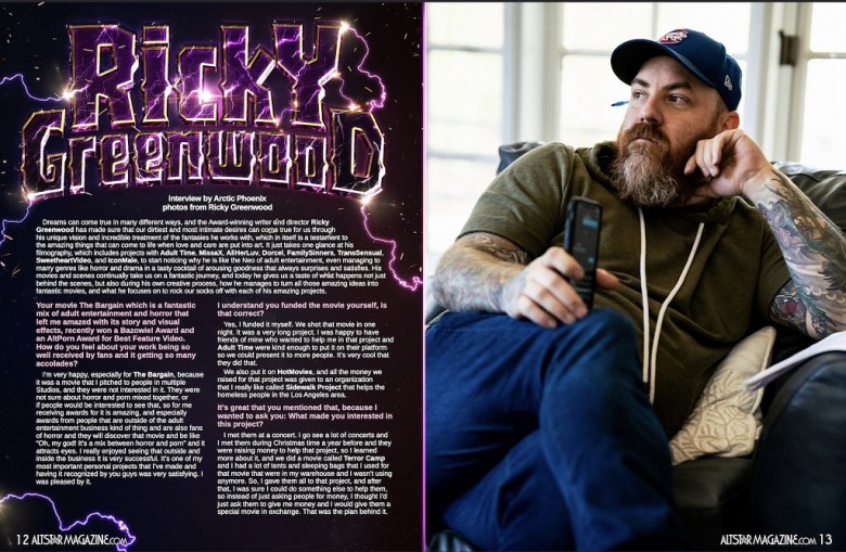 Ricky Greenwood’s exclusive interview with AltStar Magazine was released this week. His four-page interview features a photo of him and the cover of “The Bargain”, which won Best AltPorn Feature Video at the 2022 AltPorn Awards and Best Ruining Christmas from the Bazowie! Awards. Written by Artic Phoenix, the piece discusses how “The Bargain” mixes horror and porn and was self-funded, how the film raised funds for The Sidewalk Project, how he handles critiques of his work, working in many different genres as a director, challenges as a director, favorite talents to work with, what makes good adult entertainment, and more. Ricky’s feature starts on Page 12 and ends on Page 15.