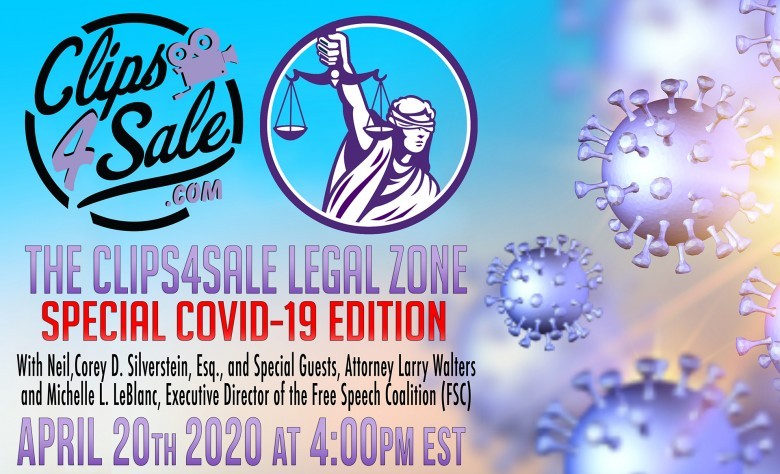 (Tampa, FL) This Monday, April 20th, at 4pm EST/1pm PST, the special COVID-19 edition of The Clips4Sale Legal Zone is happening with hosts Clips4Sale founder and leader Neil and industry premiere IT attorney Corey D. Silverstein. Joining them will be special guests Attorney Lawrence Walters and Michelle L. LeBlanc, Executive Director of the Free Speech Coalition (FSC).