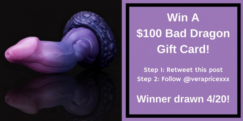 To win the $100 Bad Dragon gift card all you must do is Retweet this Tweet https://twitter.com/verapricexxx/status/981261888330887168 or look for the Tweet pinned to the top of her Twitter page, and follow Vera on Twitter at @verapricexxx. It’s that simple. One winner will be drawn at random on April 20 (aka 4/20). Everyone is welcome to participate.